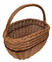 Ovaler, solider von Hand geflochtener Einkaufskorb mit Längshenkel und hübschen Einflechtungen unter dem gezopften, leicht geschwungenem Rand.